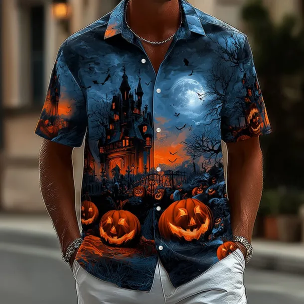 Halloween Men’s Pumpkin Haunted House Halloween Costumes Shirt Button Up Shirt Short Sleeve Dark Punk Gothic Style Holiday Streetwear Summer Spring Turndown 3D Print Collared Shirts Blue Dark Blue