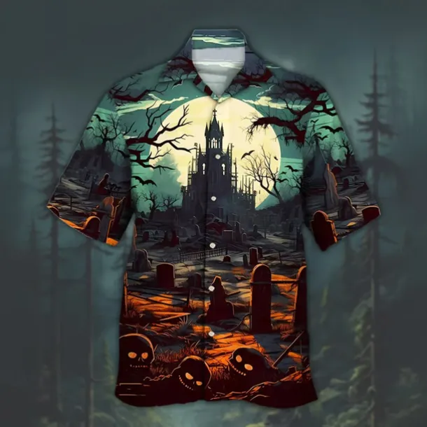 Halloween Men’s Pumpkin Haunted House Halloween Costumes Shirt Cuban Collar Shirt Button Up Shirt Short Sleeve Dark Punk Gothic Style Holiday Streetwear Summer Camp Collar Shirt 3D Print Blue Green