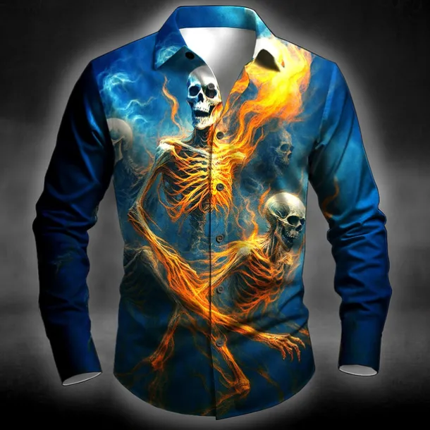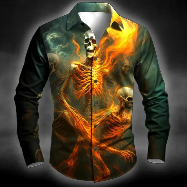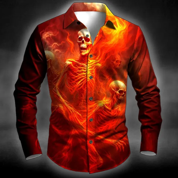 Halloween Men’s Skull Flame Halloween Costumes Shirt Button Up Shirt Long Sleeve Dark Punk Gothic Style Outdoor Holiday Summer Spring Turndown 3D Print Collared Shirts Red Blue Dark Green