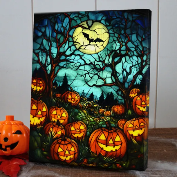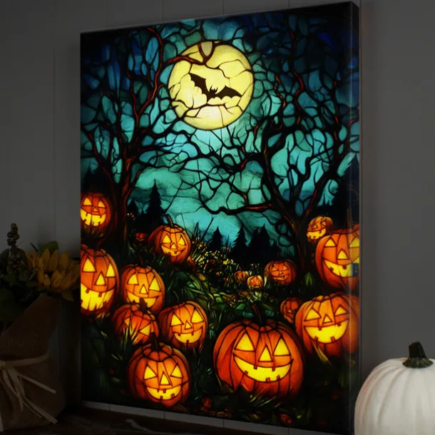 Halloween Pumpkin Clock Night Scene LED Canvas Wall Art – Battery Operated Lighted Wall Decor for 2025 Halloween home decoration light livingroom and bedroom