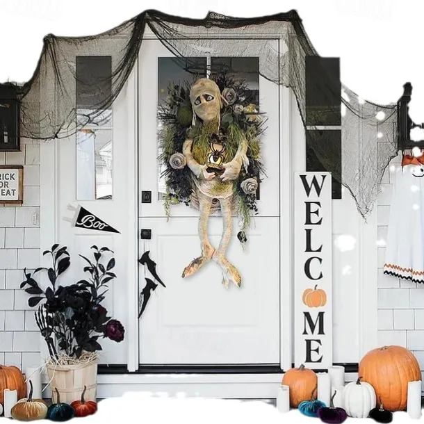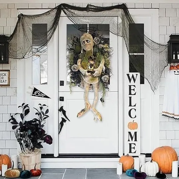 Halloween Scary Mummy Welcome Wreath Sign Mummy Halloween Round Door Hanging Plaque for Halloween Thanksgiving Christmas Home Decor Halloween Welcome Wreath