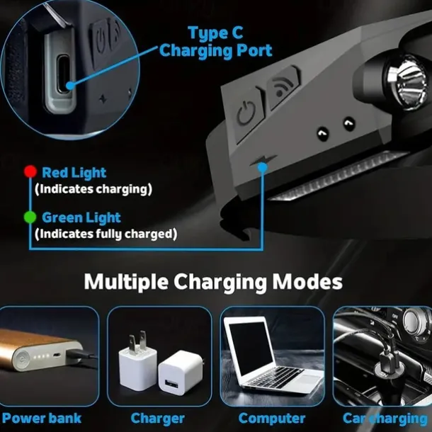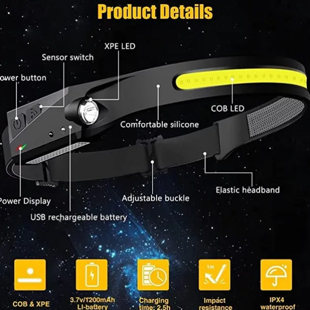 - Rechargeable design: LED headlight has five lighting modes COB high mode, COB low mode, XPE high mode, XPE low mode and strobe mode, you can click the switch to change the mode, long press the switch to switch the frequency flash mode.