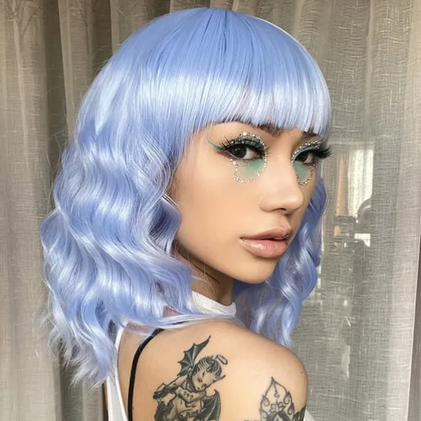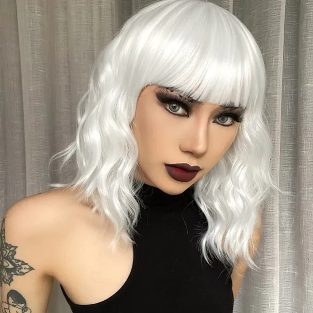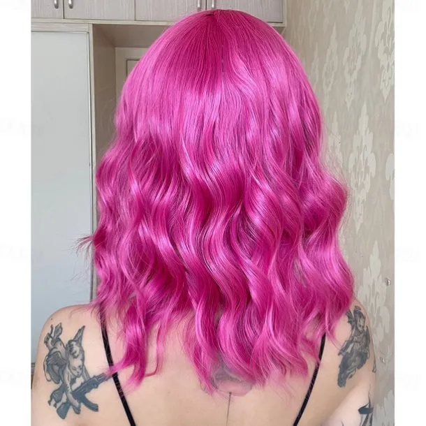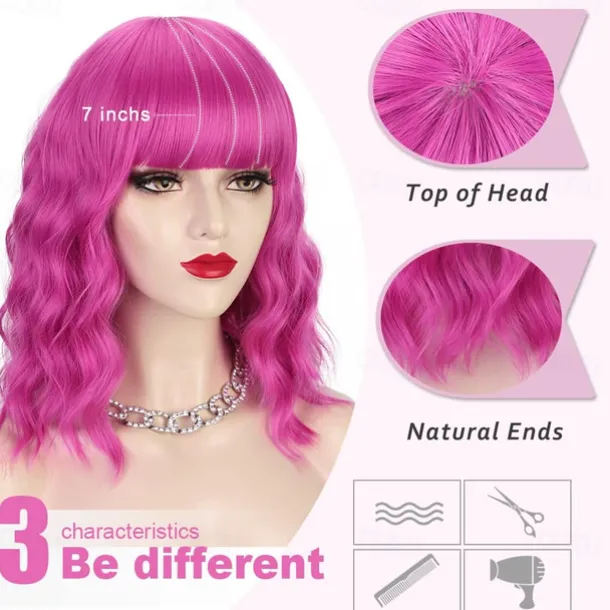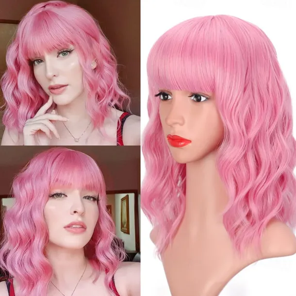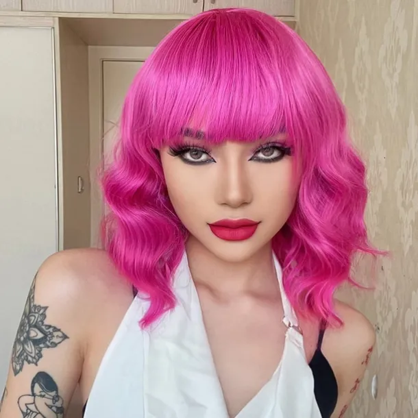 Hot Pink Wig with Bangs Short Bob Wavy Curly Wig Shoulder Length Hot Pink Wigs for Women Synthetic Hair Colorful Wig for Halloween Costume Cosplay 14 Inch