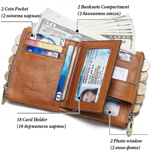 3. Features multiple compartments including interior slot pocket, zipper pocket, and coin pocket for organized storage of your essential items.