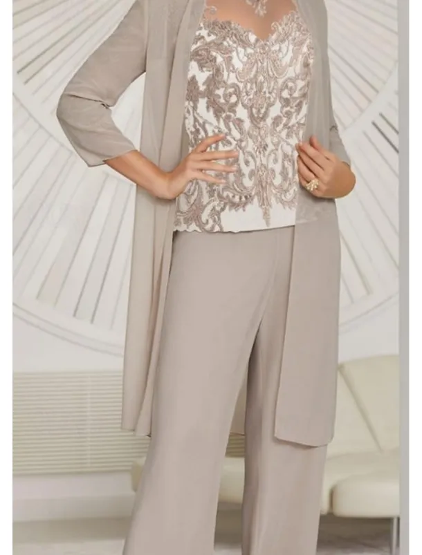 Jumpsuit / Pantsuit 3 Piece Mother of the Bride Wedding Guest Elegant Illusion Neck Floor Length Chiffon Lace Long Sleeve with Ruching Solid Color free custom size