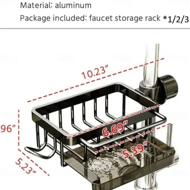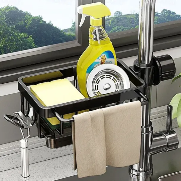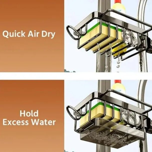 Kitchen Sink Faucet Organizer,Rustproof Aluminum Holder for Sponge, Soap, Brush, Space-Saving Design with Drip Tray, Easy Installation