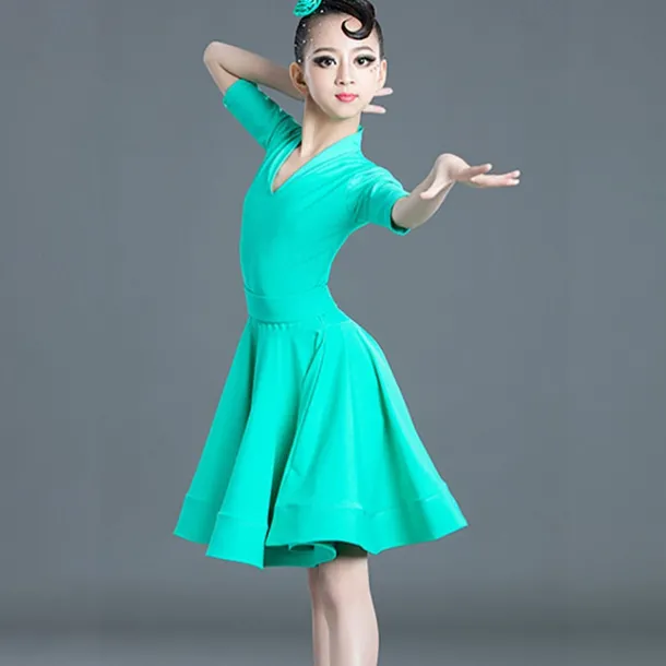Latin Dance Kids’ Dancewear Dress Pure Color Splicing Girls’ Performance Training Half Sleeve High Polyester