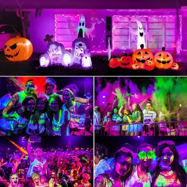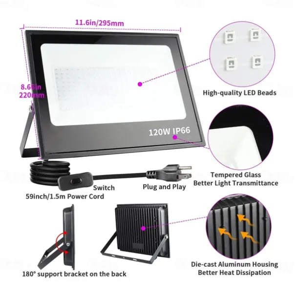 LED Black Lights 1-2 Pack of 30W 60W 120W UV Floodlight 395nm-405nm IP66 Waterproof High-power Black Light Plug with Switch (59in) for Parties Stages UV Resin Curing Paint for Halloween