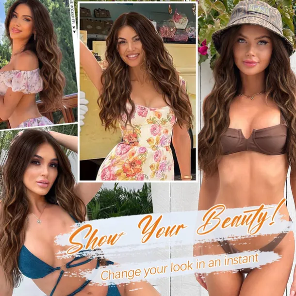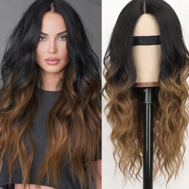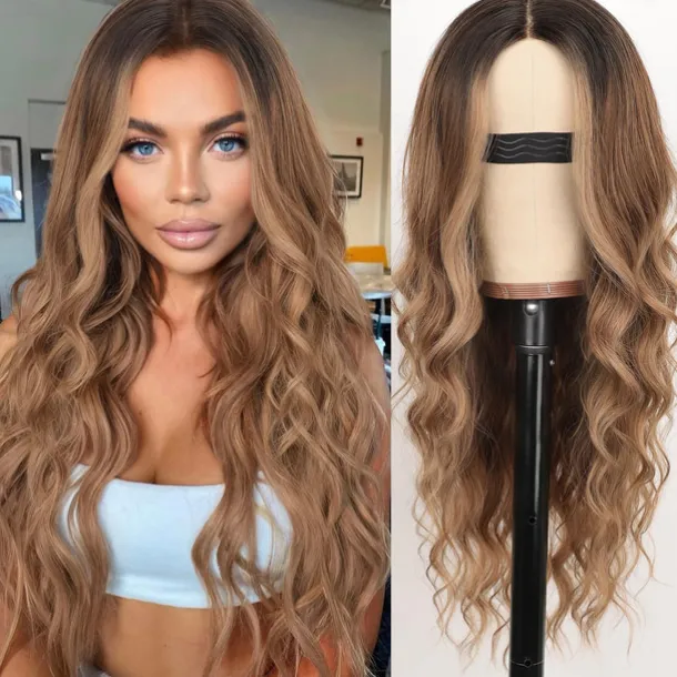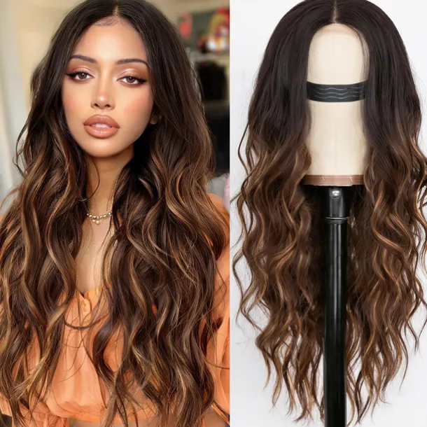 Long Brown Wavy Wig with Highlights Middle Part Curly Wigs Lace Hairline Wigs for Women Ombre Brown Synthetic Heat Resistant Wigs for Daily Part Use