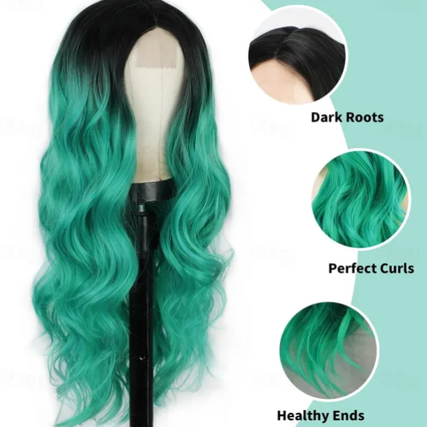 Long Wavy Wig for Women Ombre Green Middle Part Wigs Teal Wigs Long Curly Synthetic Heat Resistant Hair with Natural Hairline for Cosplay Party Everyday Use St.Patrick’s Day Wigs