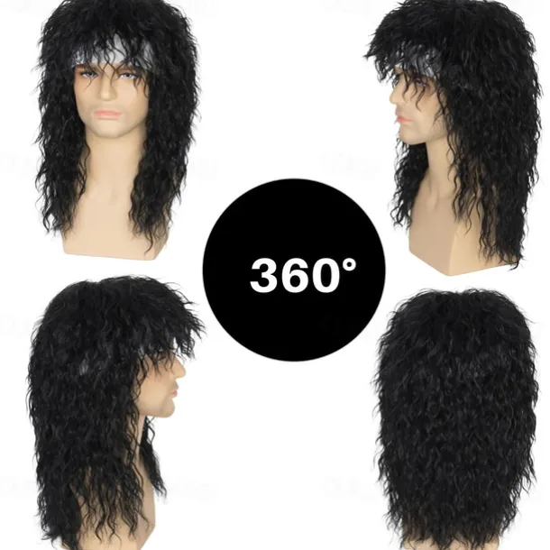 Men’s 80s Mullet Wig Black Curly Wig Punk Rocker Wig Party Cosplay Hair with Accessories Halloween Wigs