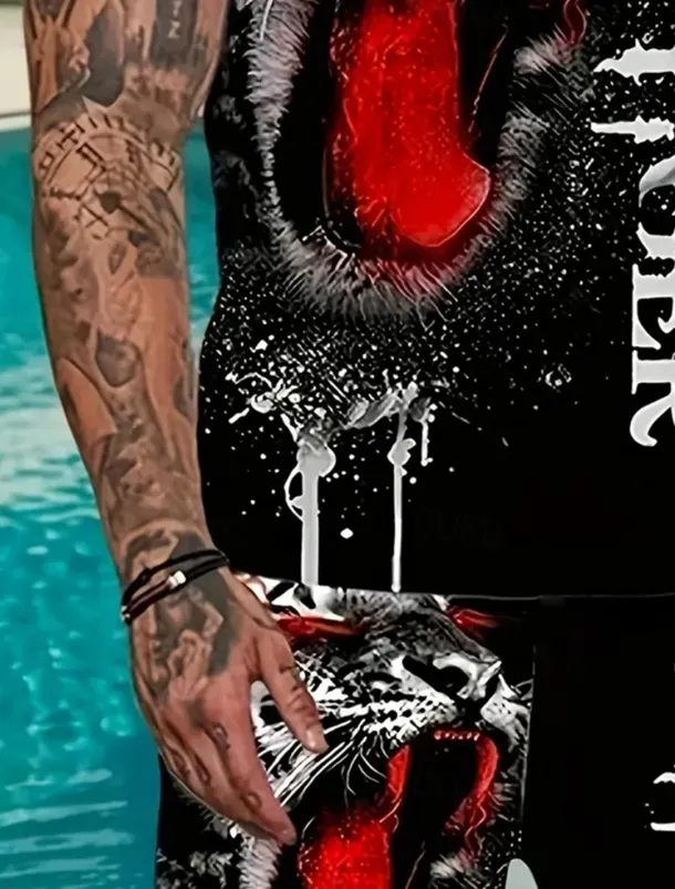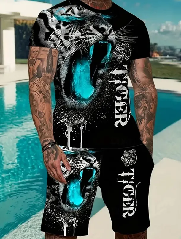 Men’s Animal Tiger 2pcs Tees sets Summer Tops Short Sleeve Short Pants Crew Neck Sport Casual Trendy Outdoor Casual Daily 3D Print Summer Blue Red