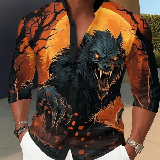 Men’s Animal Wolf Devil Shirt Stand Collar Shirt Long Sleeve Dark Punk Gothic Style Holiday Spring Fall Mandarin Collar Band Collar 3D Print Button Up Shirts Blue Orange