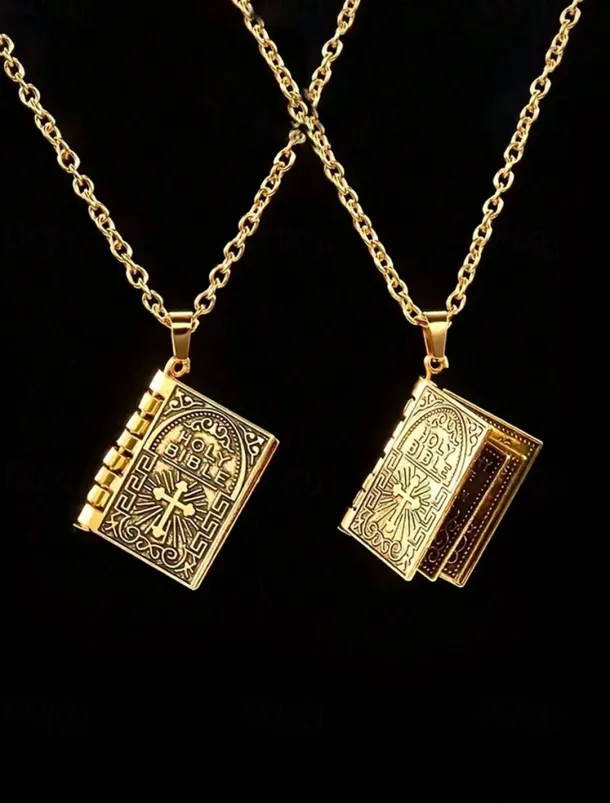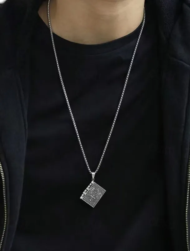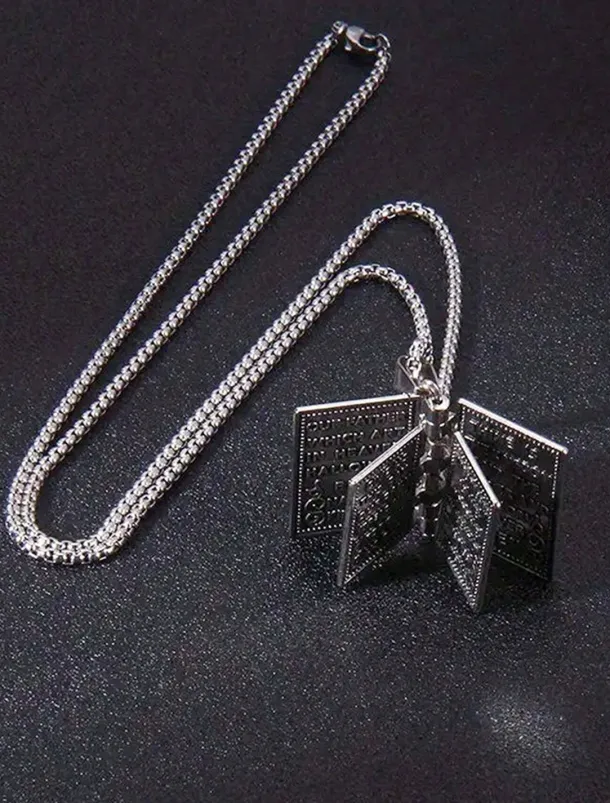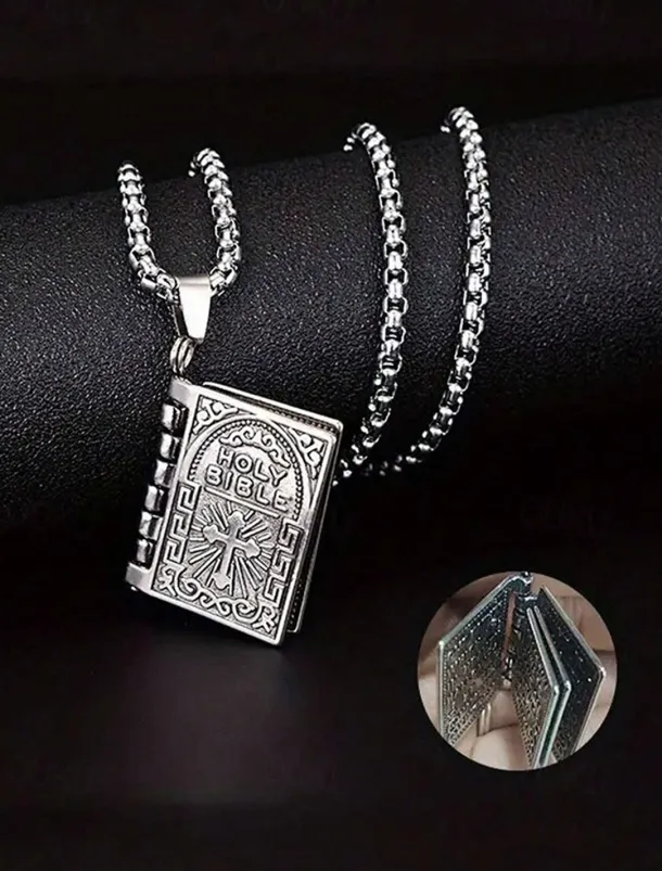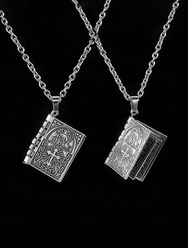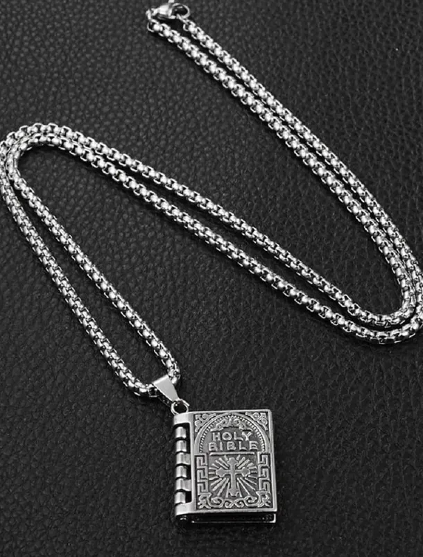 Men’s Bible Pendant Necklace – Silver Religious Jewelry with Cross Detail, Christian Faith Accessory for Daily Wear and Special Occasions