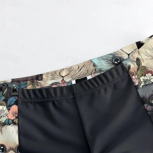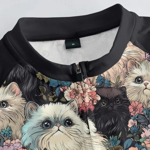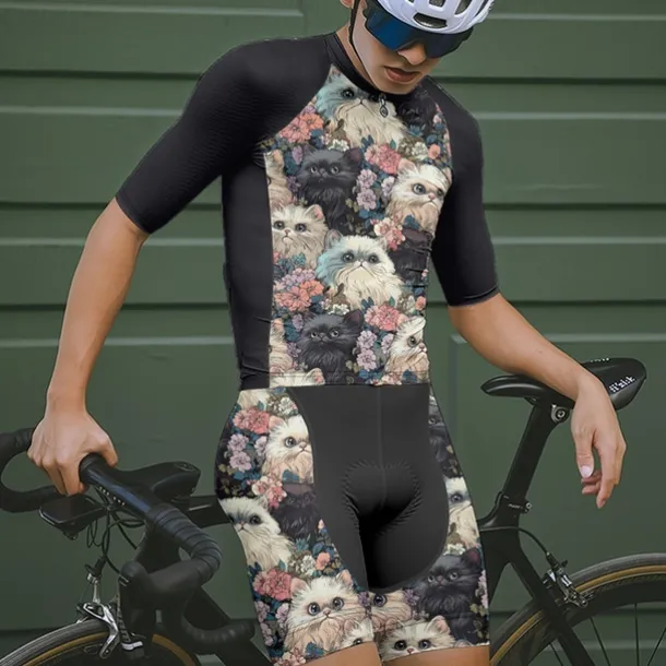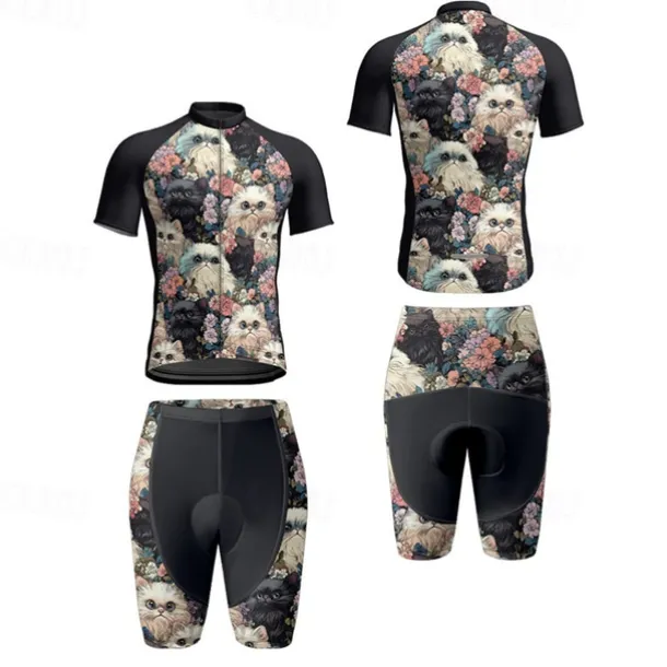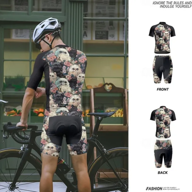 Men’s Cycling Jersey with Shorts Cat Floral Botanical Short Sleeve Bike Clothing Suit with 3 Rear Pockets Mountain Bike MTB Road Bike Cycling Front Zipper Sweat wicking Comfortable Breathable Sports