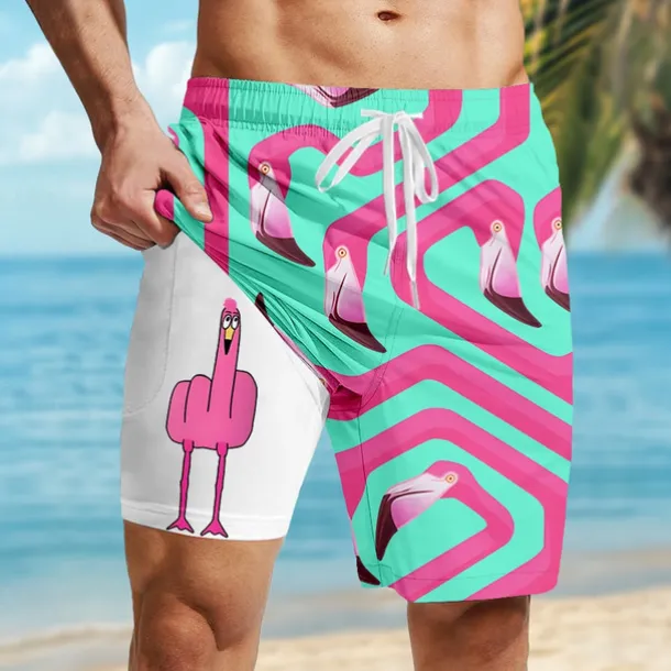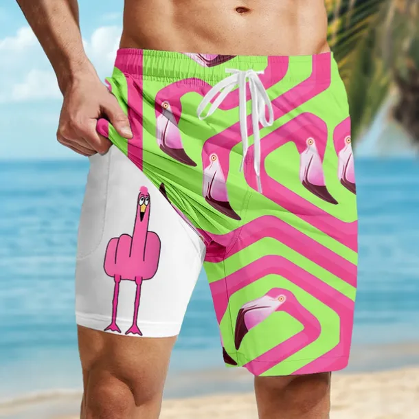 Men’s Flamingo Bird Funny Lined Shorts 2 in 1 Board Shorts Swim Shorts Mid Waist Hawaiian Vacation Holiday Beach Wear Side Pockets With Compression Liner Elastic Drawstring Waist Designer Clothing