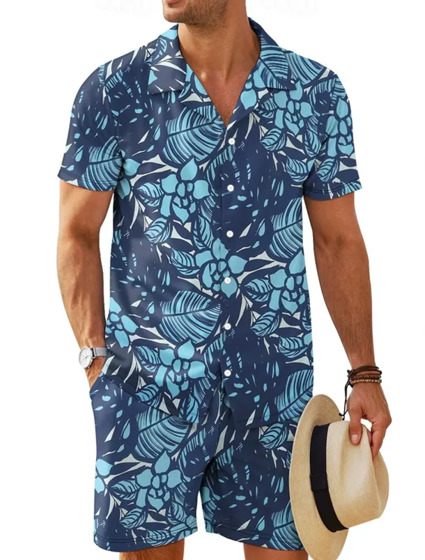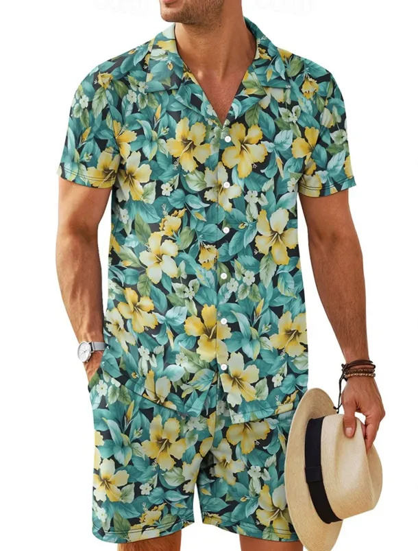 Men’s Floral 2pcs Shirts Sets Shirt Short Sleeve Short Pants Cuban Collar Vacation Casual Daily Vacation Wear 3D Print Summer Robin’s Egg Blue Green Brown