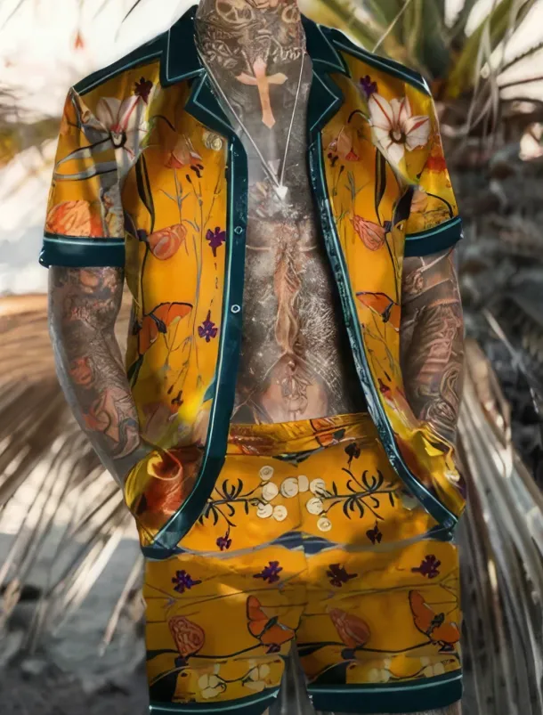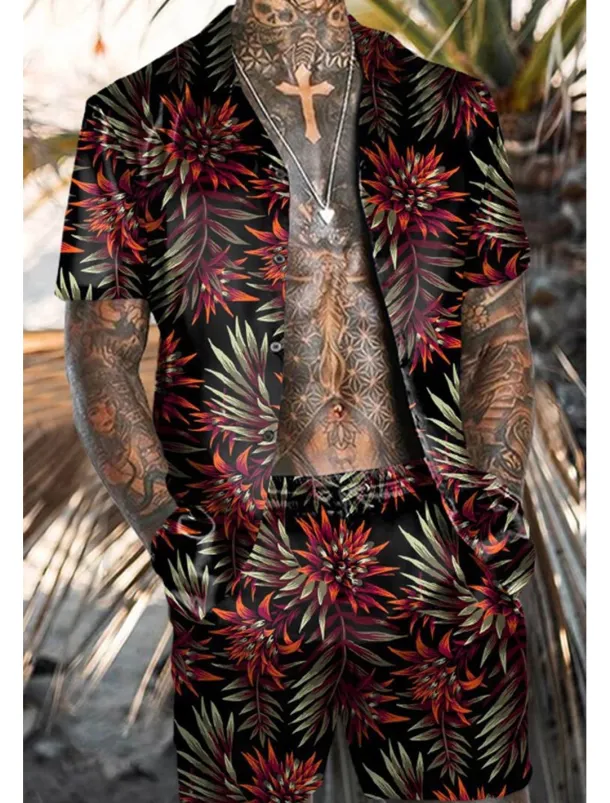 Men’s Floral Flamingo 2pcs Shirts Sets Summer Hawaiian Shirt Short Sleeve Short Pants Turndown Tropical Fashion Hawaiian Street Casual Hawaiian Print Summer Spring Black Red Orange