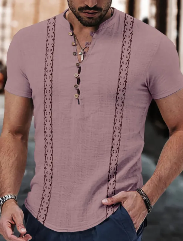 Collaborating with The Laundry Room we proudly present a limited edition custom made Men’s linen shirt adorned with a unique geometric print Individually hand dyed this exquisite shirt is as unique as you are featuring a contemporary cut stand collar and short sleeves Soft stylish and machine washable it’s an effortless addition to your streetwear or casual attire in spring or summer