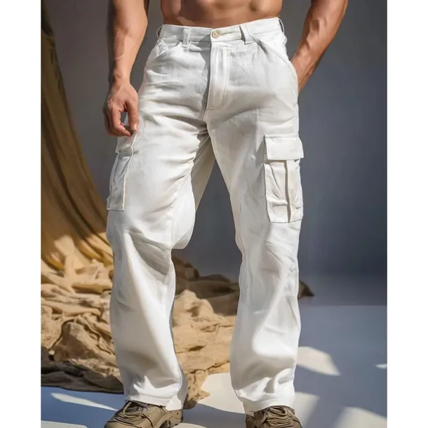 Men’s Linen Pants Trousers Summer Pants Multi Pocket Straight Leg Plain Comfort Breathable Full Length Outdoor Casual Daily Fashion Streetwear Black White