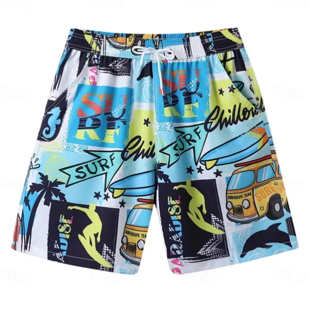 Men’s Shorts Beach Shorts Drawstring Graphic Letter Abstract Breathable Quick Dry Knee Length Outdoor Vacation Home Vacation Ethnic Style Lake blue White & Blue Stretchy