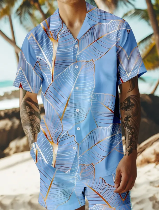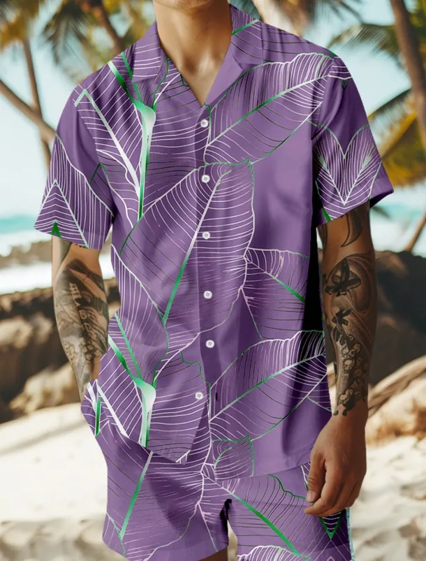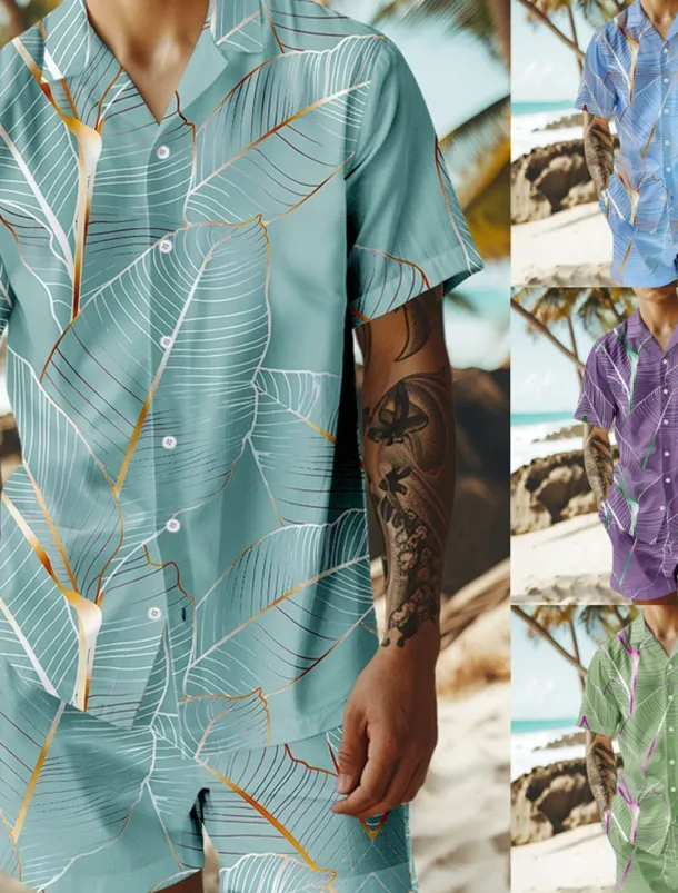 Men’s Trees / Leaves 2pcs Shirts Sets Summer Hawaiian Shirt Short Sleeve Short Pants Cuban Collar Vacation Party Casual Daily 3D Print Summer Lake blue Violet Green