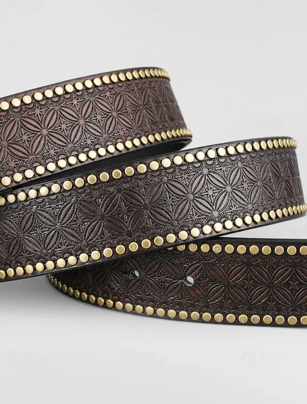Men’s Western Faux Leather Belt with Engraved Floral Design and Bull Skull Buckle – Vintage-Style Cowboy Belt for Rodeo and Casual Wear