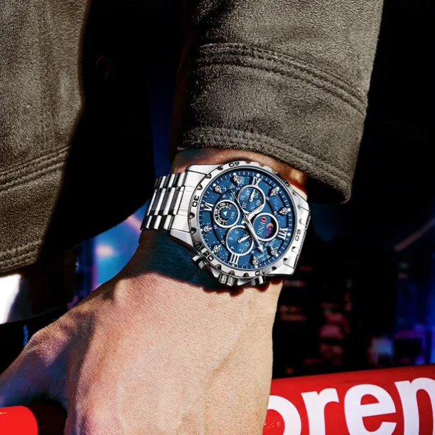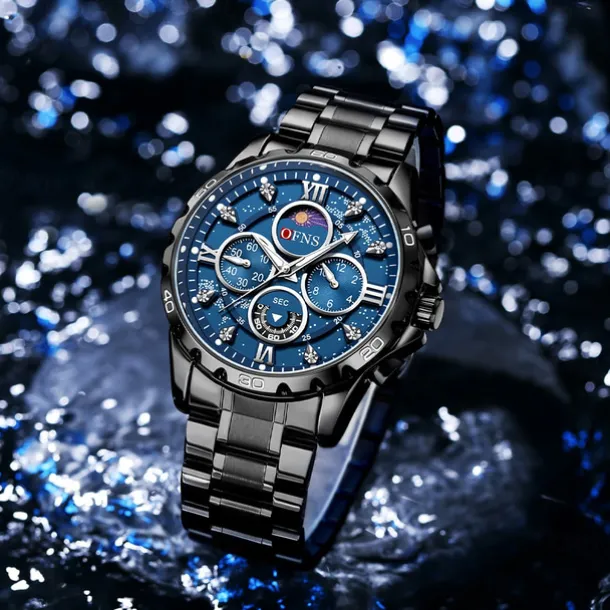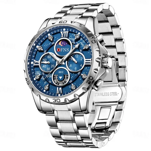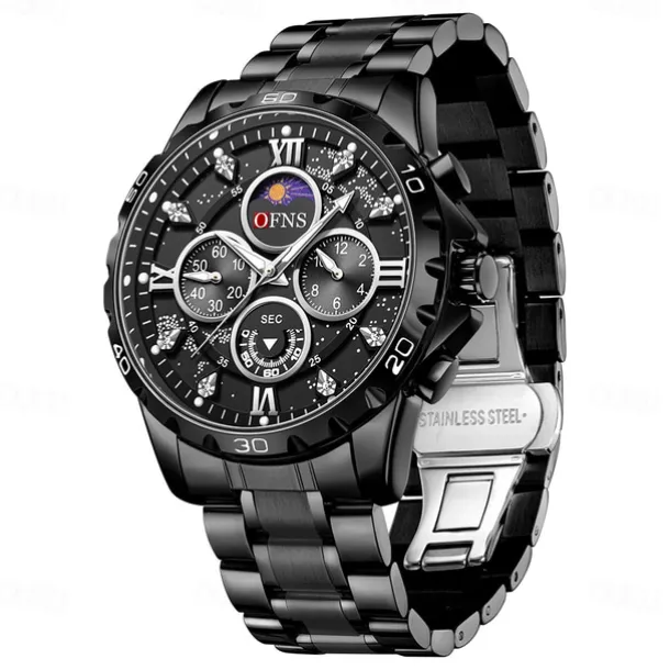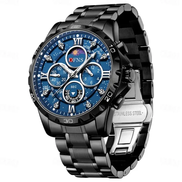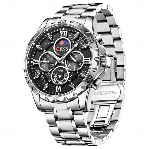 OFNS Men Quartz Watch Sports Fashion Casual Wristwatch Moon phase Luminous Chronograph Waterproof Steel Watch