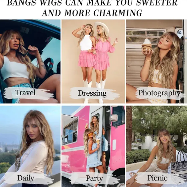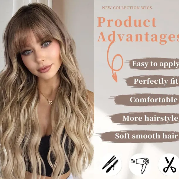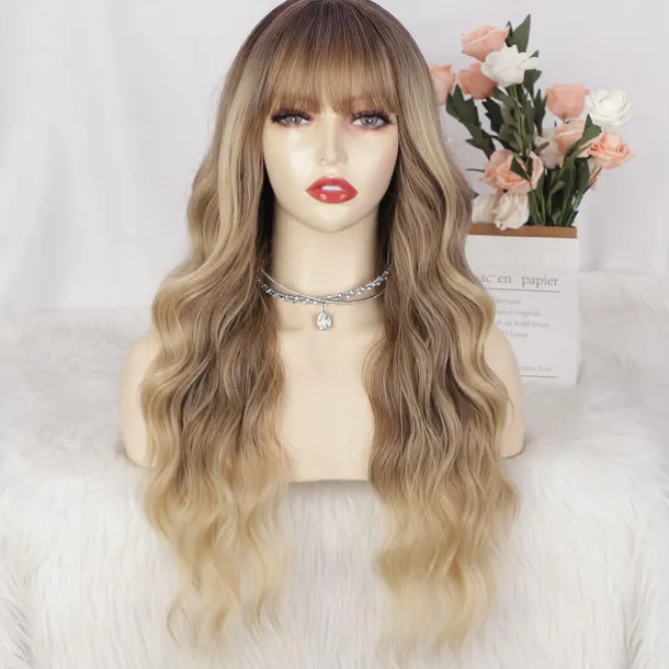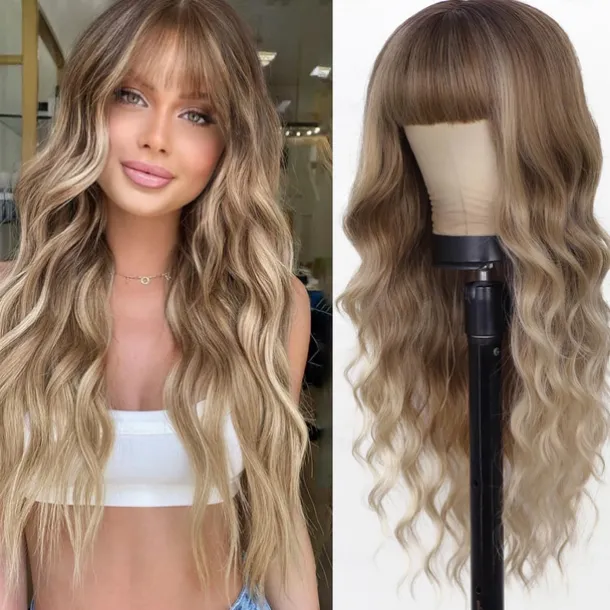 Ombre Blonde Wig with Bangs Long Blonde Wavy Wigs for Women Synthetic Curly Wavy Wigs with Dark Root Middle Part Heat Resistant Wig for Daily Party Wear Halloween Wigs
