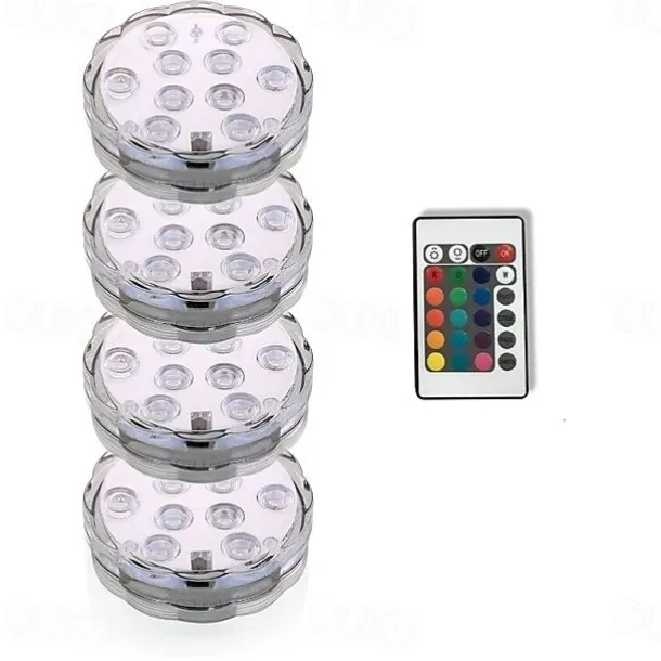 Quantity: 4pcs, LED Beads Quantity: 10, Light Color: RGB, Type: Underwater Lights, Features: Decorative, Remote Controlled, Waterproof, Flame Flickering, Wattage (W): 3, Voltage (V): 5.5, Certification: CE Certified, Primary Application: Swimming pool, Suitable for Vases & Aquariums, Net Weight (kg): 0.03,