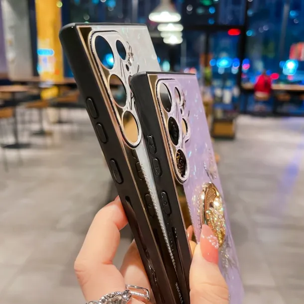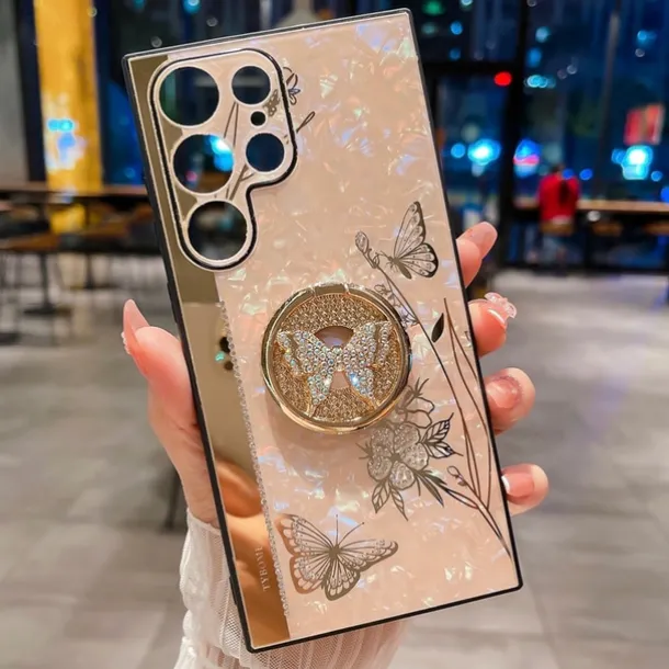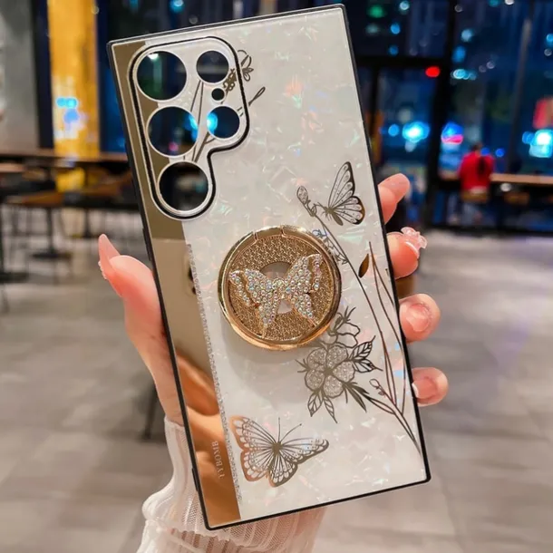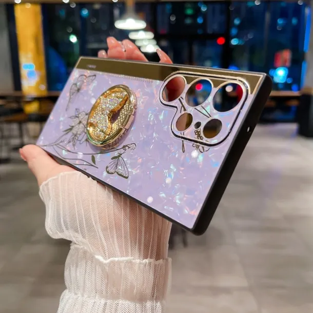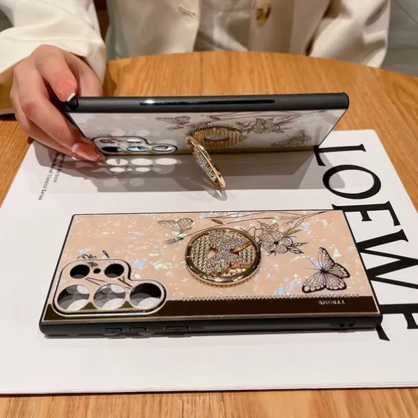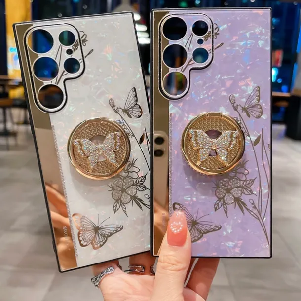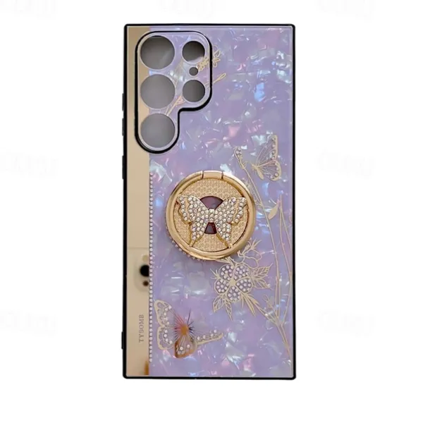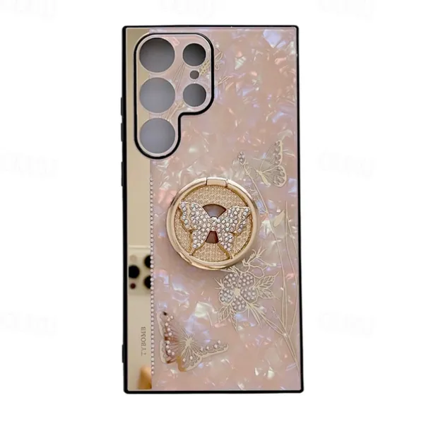 Phone Case For Samsung Galaxy S25 S24 S23 S22 S21 FE S21 Ultra Plus S20 A52 Back Cover Bumper Frame Rhinestone Ring Holder Butterfly Glitter Shine Flower TPU PC