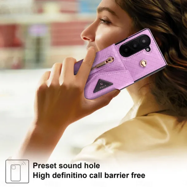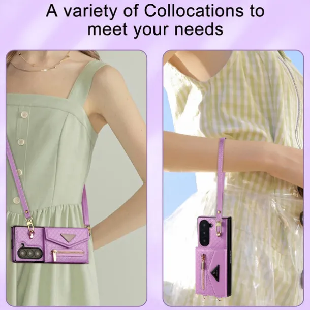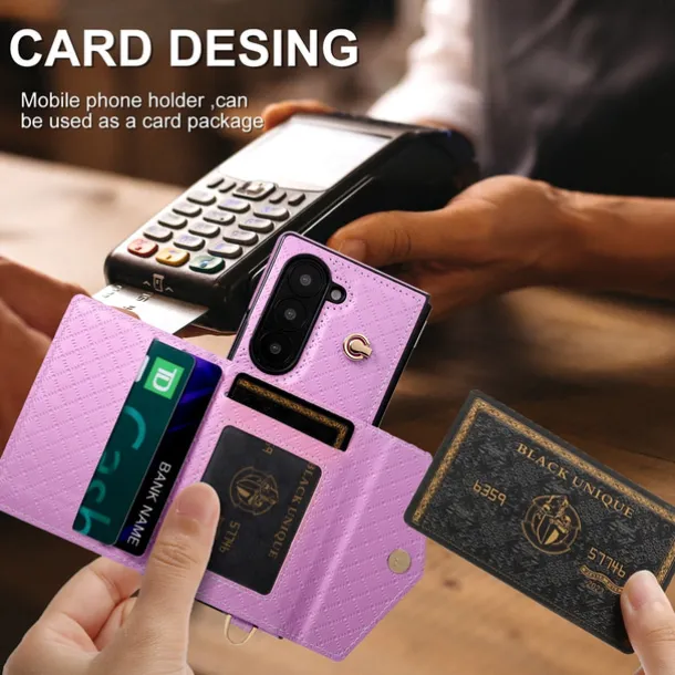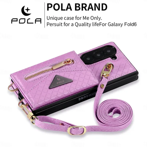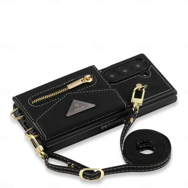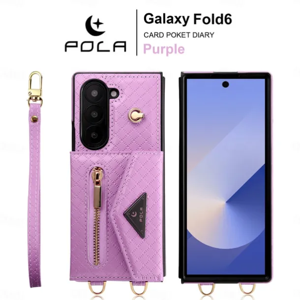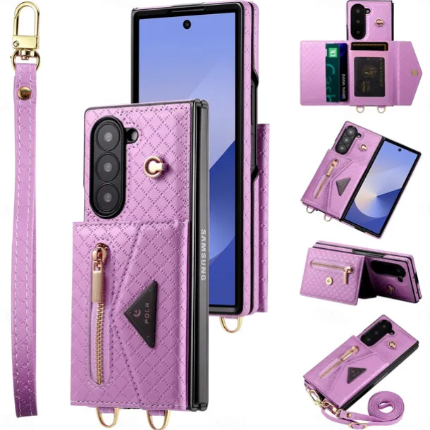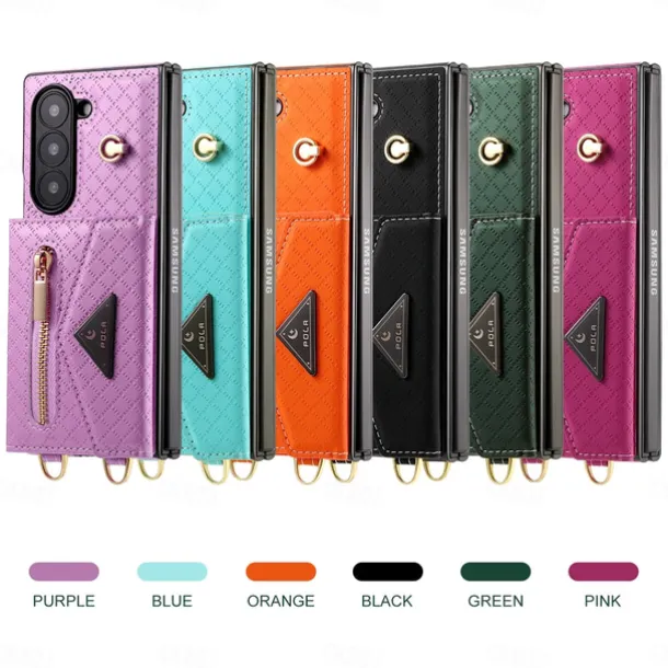 Phone Case For Samsung Galaxy Z Fold 6 Wallet Case with Stand Holder Zipper with Lanyard Retro Genuine Leather TPU