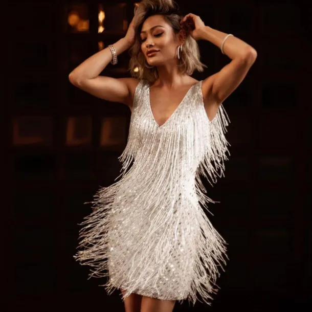 Roaring 20s 1920s Cocktail Dress Knee Length Flapper Dress Dress Masquerade The Great Gatsby Tassel Fringe Sequin Tassel Fancy Dress Women’s Christmas Carnival New Year Wedding Party Wedding Guest