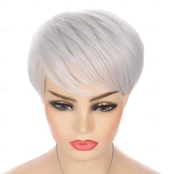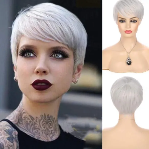 Silver Grey Wigs Short Hair Pixie Cut Straight Wig with Bangs Synthetic Cosplay Full Wigs for Women Heat Resistant Carnival Costume Party