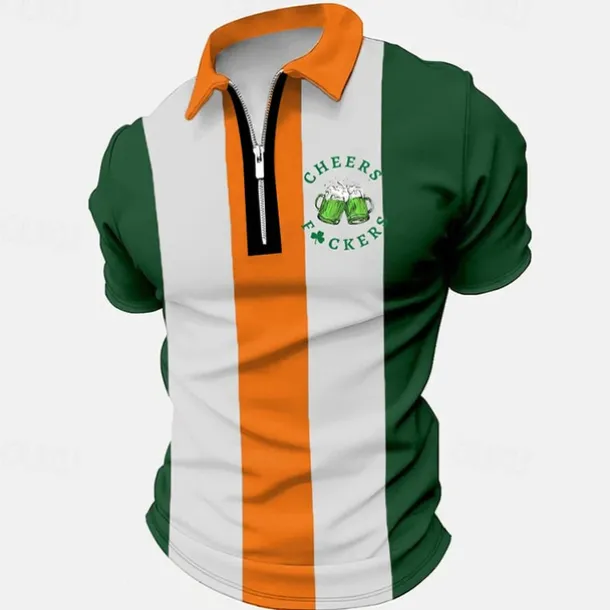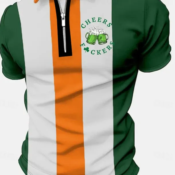 St.Patrick’s Day Men’s Zip Polo Polo Shirt Golf Shirt Beer Saint Patrick Day St. Patrick’s Day Clover Turndown Green Outdoor Street Short Sleeves Zipper Print Clothing Apparel Fashion Designer Casual