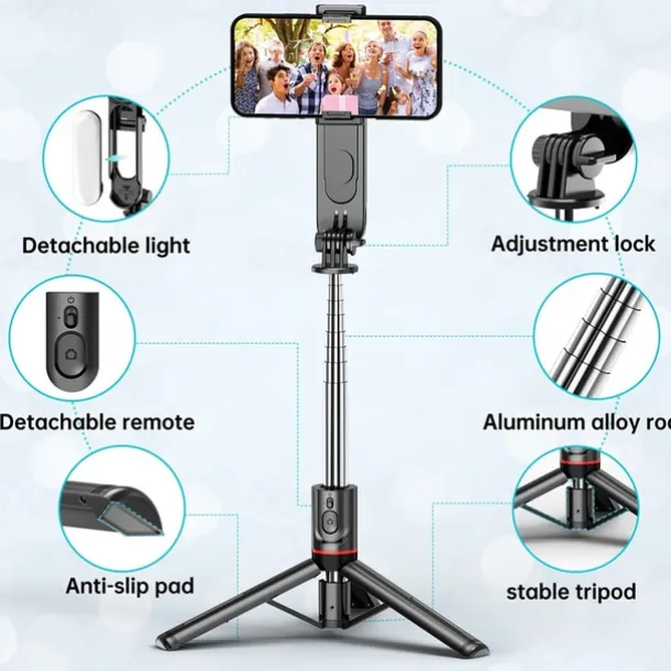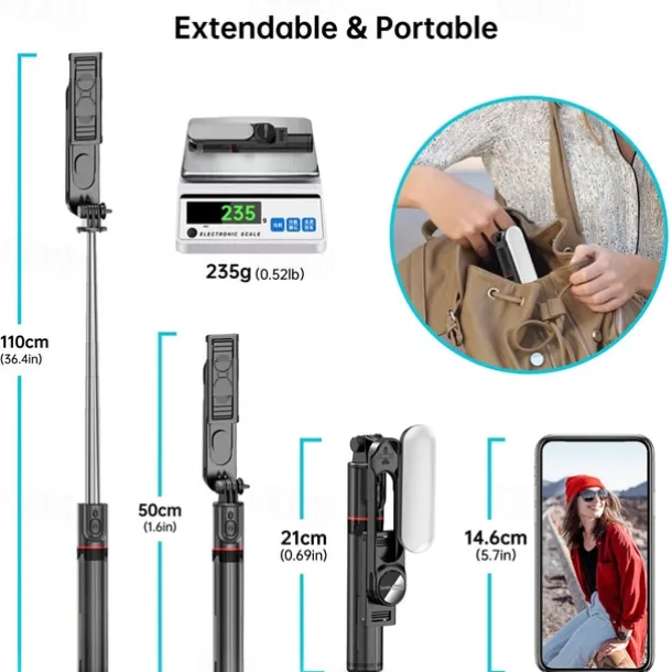 – Remote Shutter: The phone tripod comes with a built-in wireless remote control, enabling shooting within a range of 10 meters. It is compatible wi