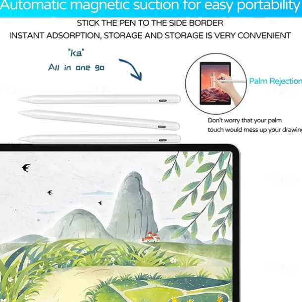 – Palm rejection and magnetic suction: With palm rejection technology, you can comfortably draw or write without worrying about accidentally smudging your work. Plus, the stylus attaches easily next to your iPad for convenient carrying – thanks to the magnetic suction effect.