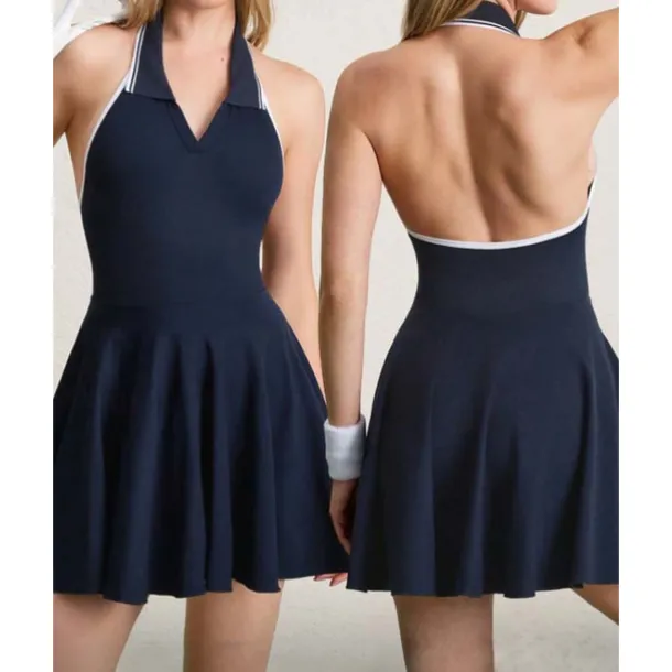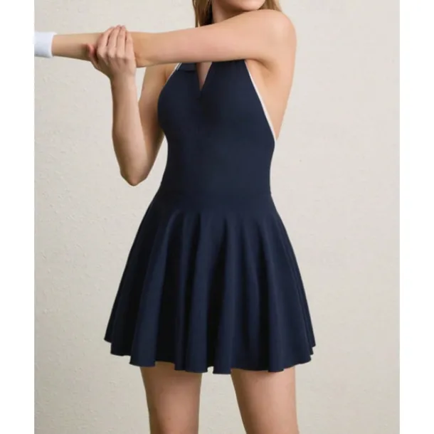 US Open Women’s Patchwork Tennis Dress with Built in Shorts and Bra Sports Dress Sleeveless Pleated Breathable Tennis Golf Pickleball V Neck Open Back Dark Navy Tennis Clothing