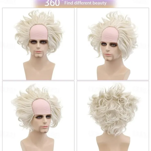 White Wig Men, Short Wavy Bald Wig Messy Mad Scientist Wig Old Man Wig Fluffy Crazy Funny Wig Halloween Wigs