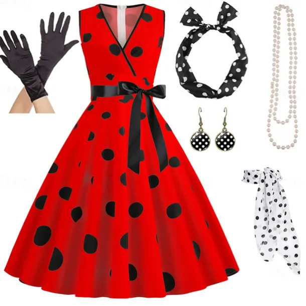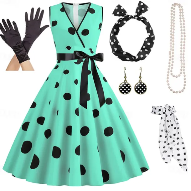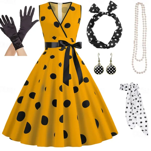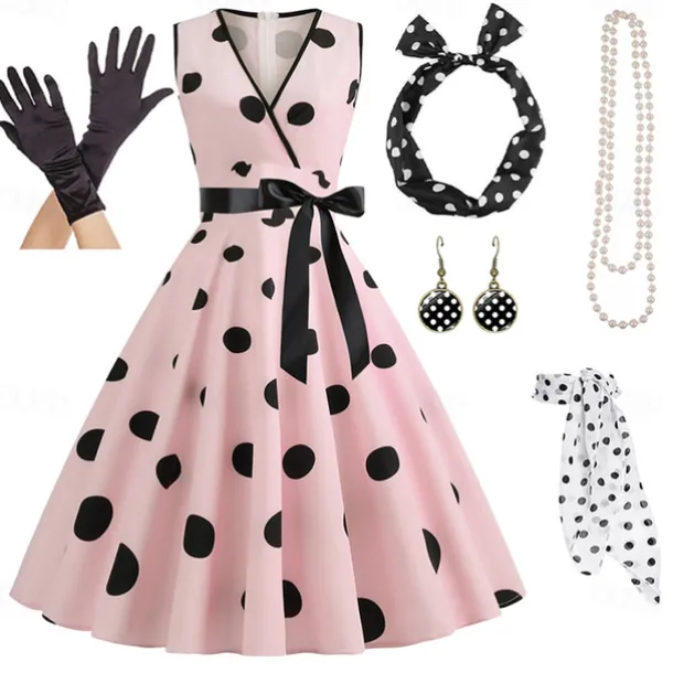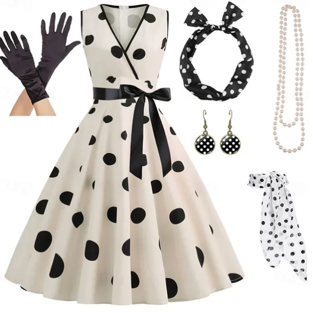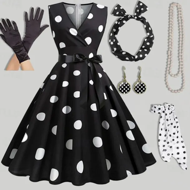 Women’s A-Line Rockabilly Dress Polka Dots Swing Dress Flare Dress with Accessories Set 1950s Grease Outfits 60s Retro Vintage with Headband Chiffon Scarf Earrings Pearl Necklace Gloves