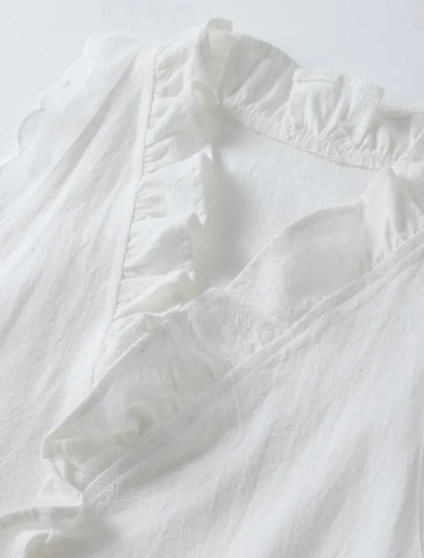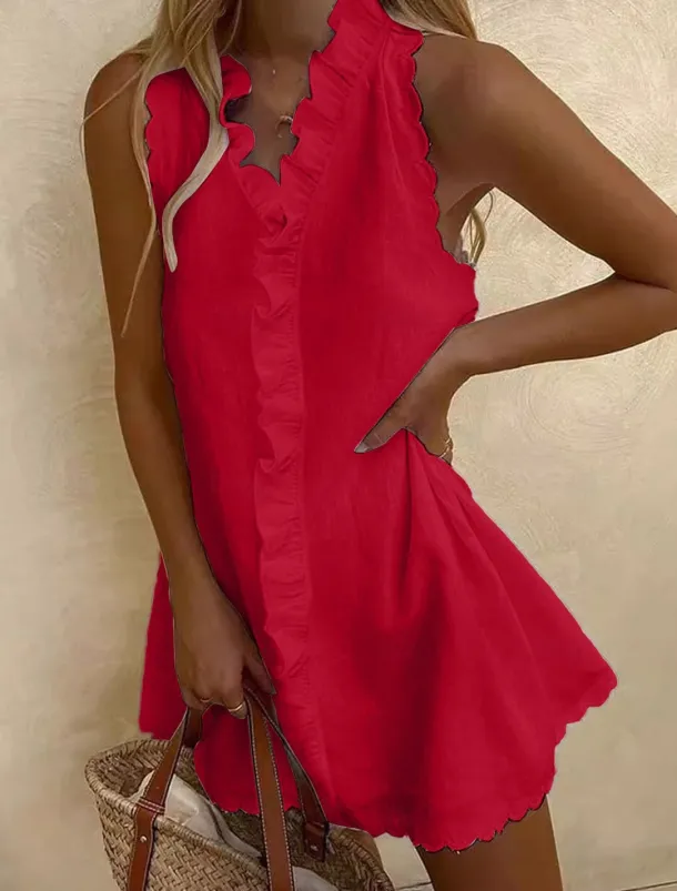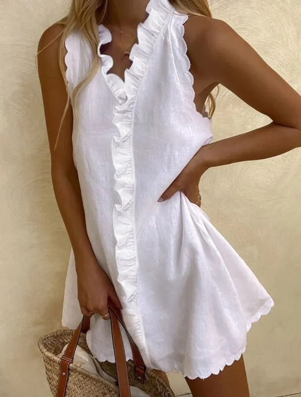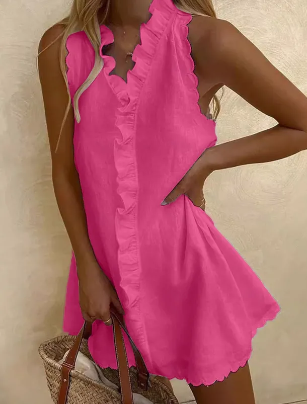 – Designed with a loose fit for a relaxed and effortless look, this linen mini dress features a flattering V-neck and trendy ruffle detailing.