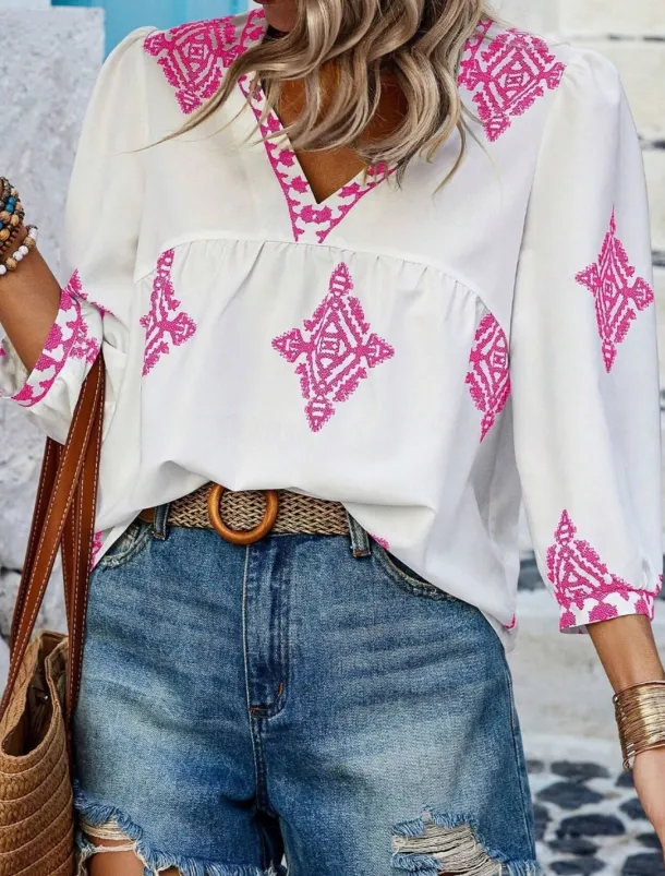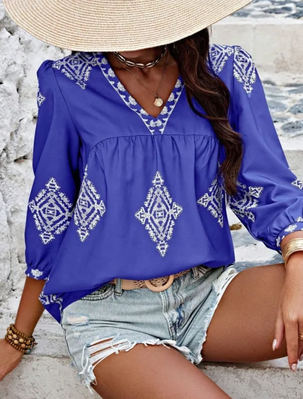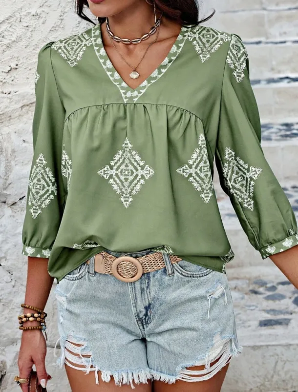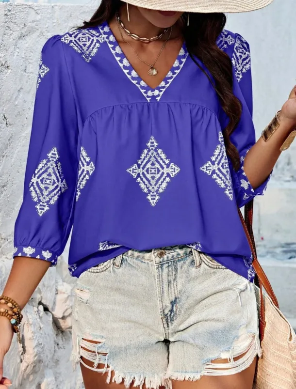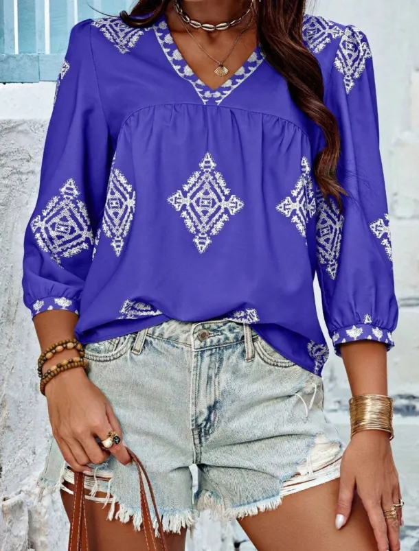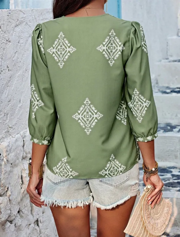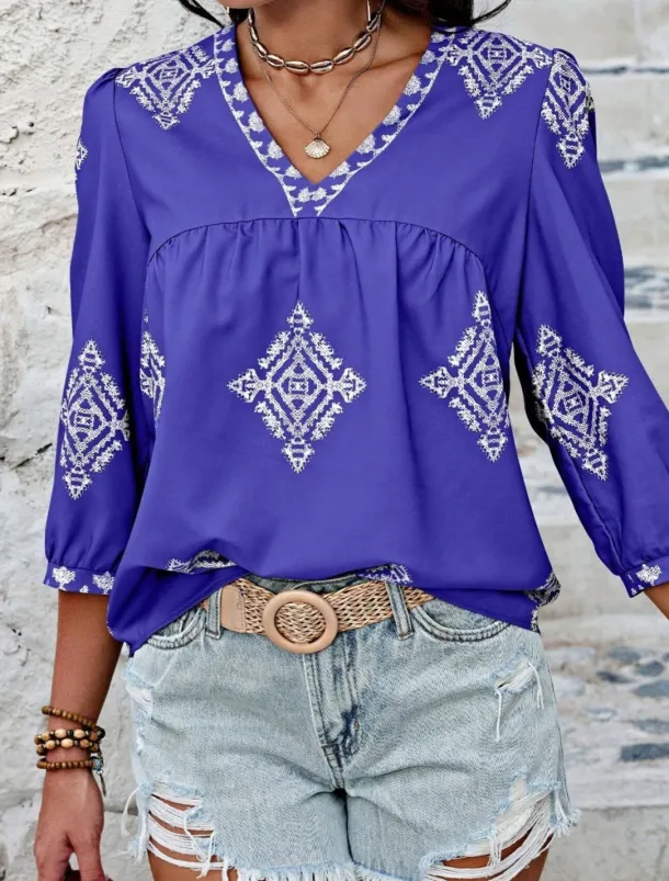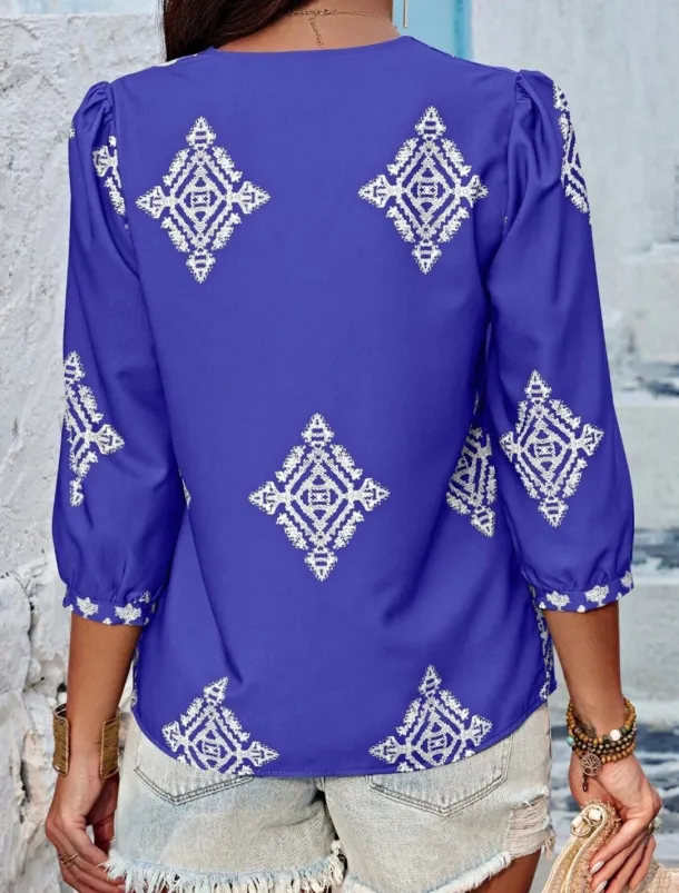 Women’s Blouse Geometric Bohemia Casual 3/4 Length Sleeve Puff Sleeve V Neck Regular Tops Daily Print Pink Navy Blue Purple Green Summer Spring