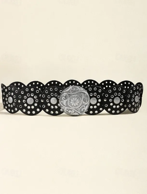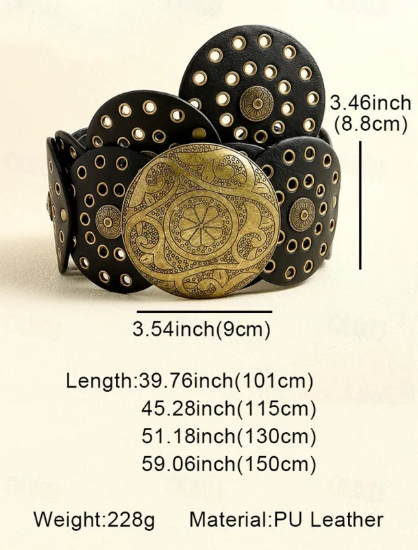 Women’s Brown Faux Leather Belt with Perforated Circles and Intricate Metal Buckle – Bohemian Chic Fashion Accessory