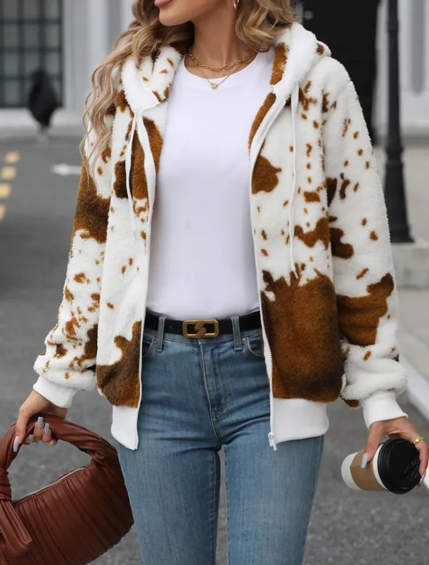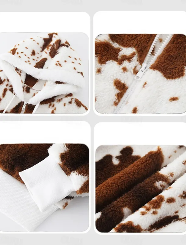 Women’s Fleece Jacket Teddy Coat Hoodie Jacket Warm Breathable Zipper Pocket Fleece Lined Casual Cow Print Vacation Street Daily Wear Going out Zipper Regular Hoodie Regular Fit Long Sleeve Outerwear