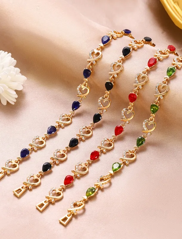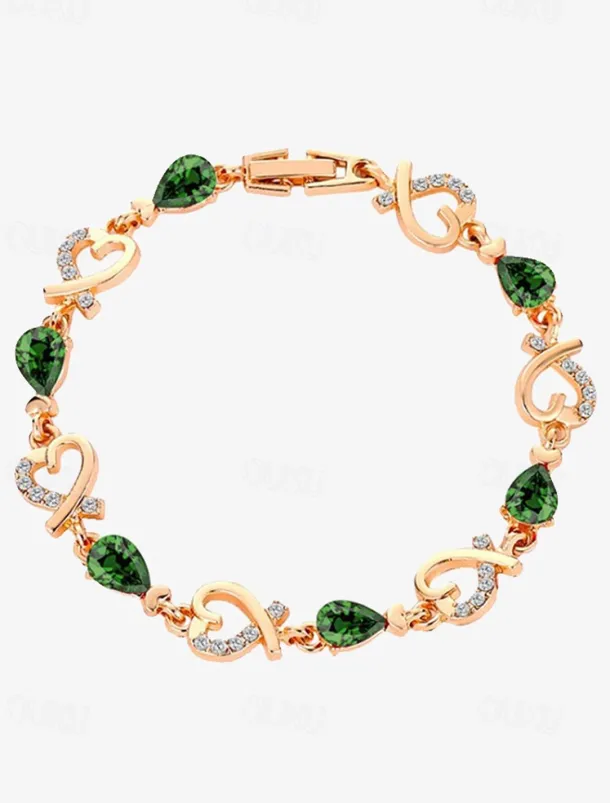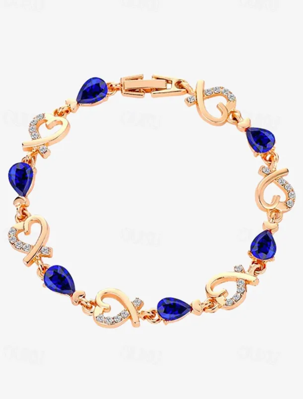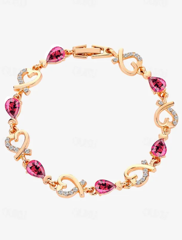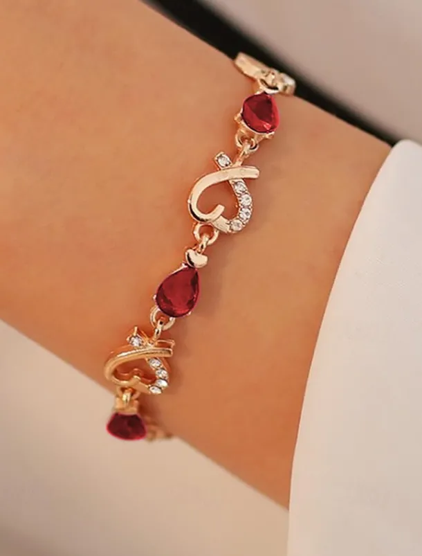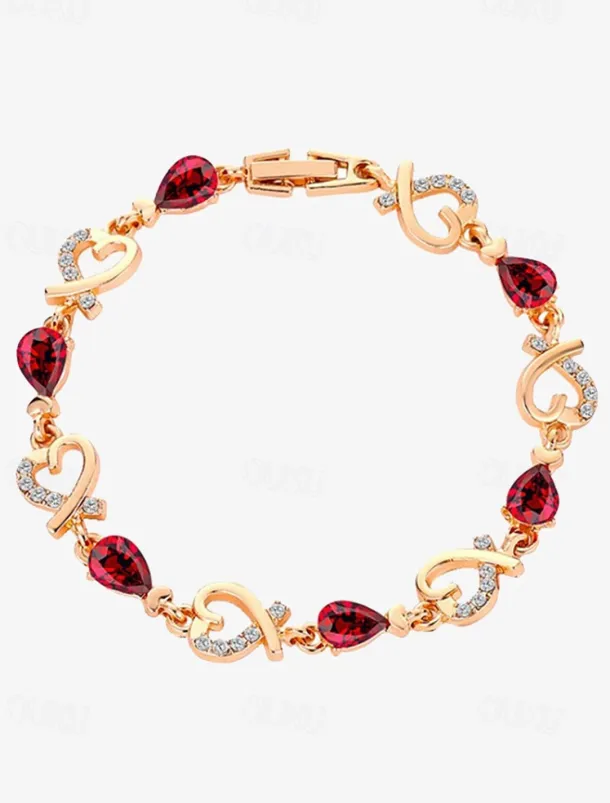 Women’s Gold Bracelet with Red Teardrop Crystals and Heart-Shaped Accents, Elegant Romantic Design for Valentine’s Day Gift, Weddings, and Special Occasions