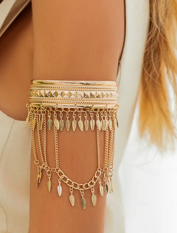 Women’s Gold Layered Arm Cuff Bracelet with Leaf Charms – Boho Statement Jewelry for Parties and Festivals