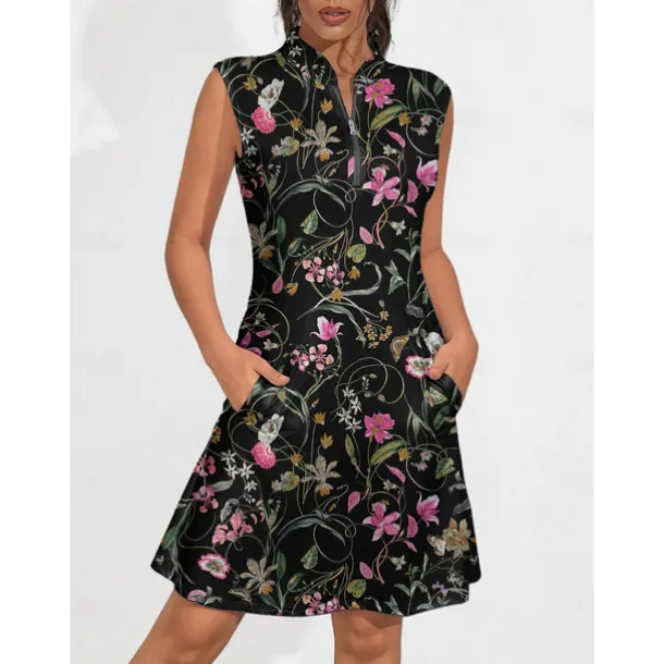 Women’s Golf Dress Black Sleeveless Floral Ladies Golf Attire Clothes Outfits Wear Apparel