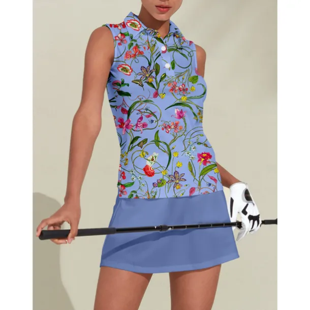 Women’s Golf Polo Shirt Blue Sleeveless Top Floral Ladies Golf Attire Clothes Outfits Wear Apparel