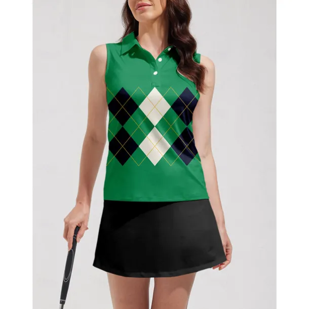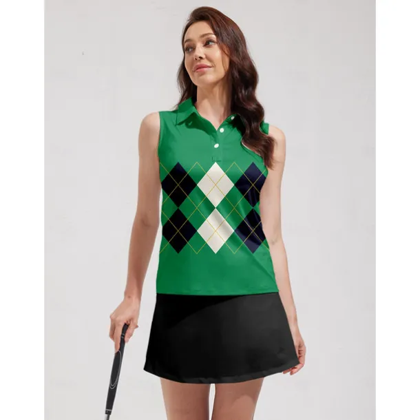 Women’s Golf Polo Shirt Green Sleeveless Top Plaid Ladies Golf Attire Clothes Outfits Wear Apparel