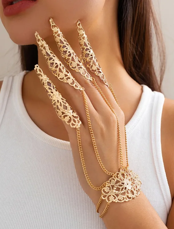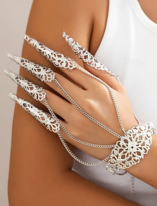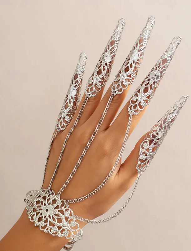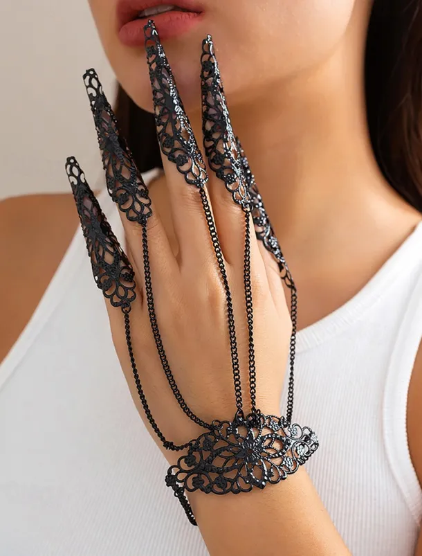 Women’s Gothic Black Lace Finger Armor with Chains, Intricate Halloween Costume Jewelry for Cosplay and Special Occasions